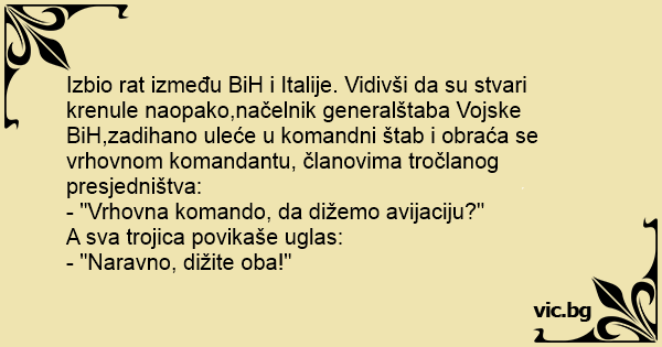 Izbio rat između BiH i Italije. Vidivši da su stvari krenule naopako,načelnik generalštaba Vojske BiH,zadihano uleće u komandni štab i obraća se vrhovnom komandantu, članovima tročlanog presjedništva: