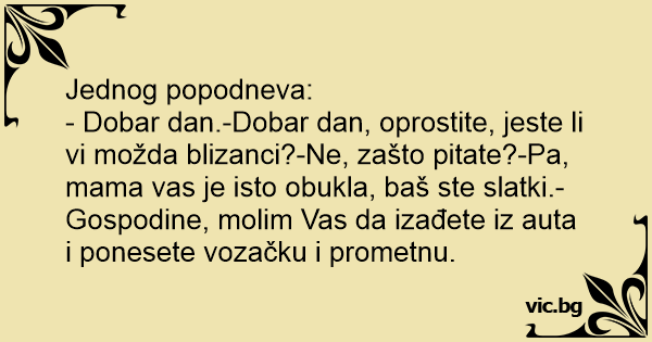 - Dobar dan.-Dobar dan, oprostite, jeste li vi možda blizanci?-Ne, zašto pitate?-Pa, mama vas je isto obukla, baš ste slatki.-Gospodine, molim Vas da izađete iz auta i ponesete vozačku i prometnu.