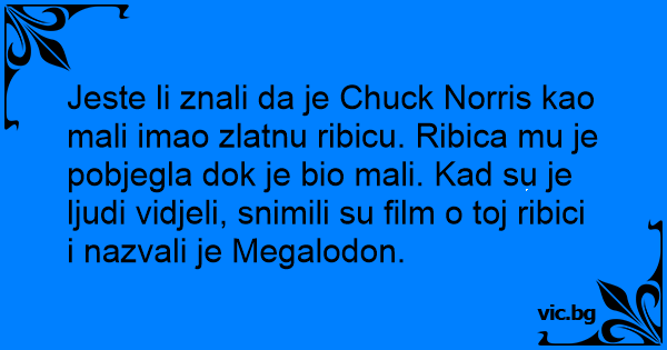 Jeste li znali da je Chuck Norris kao mali imao zlatnu ribicu. Ribica mu je pobjegla dok je bio mali. Kad su je ljudi vidjeli, snimili su film o toj ribici i nazvali je Megalodon.