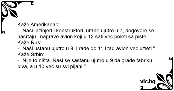 - "Nije to ništa. Naši se sastanu ujutro u 9 da grade fabriku piva, a u 10 već su svi pijani."