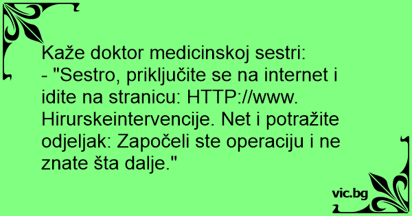 - "Sestro, priključite se na internet i idite na stranicu: HTTP://www. Hirurskeintervencije. Net i potražite odjeljak: Započeli ste operaciju i ne znate šta dalje."