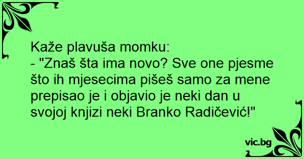 - "Znaš šta ima novo? Sve one pjesme što ih mjesecima pišeš samo za mene prepisao je i objavio je neki dan u svojoj knjizi neki Branko Radičević!"