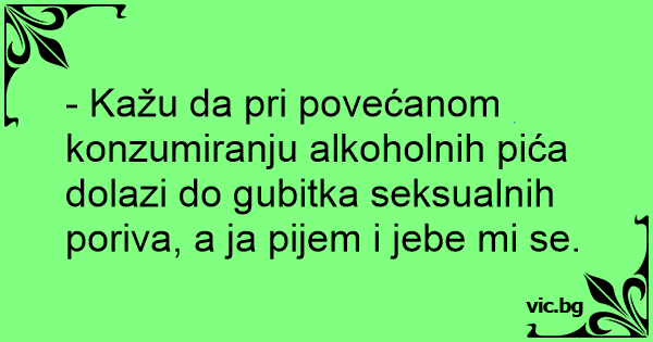- Kažu da pri povećanom konzumiranju alkoholnih pića dolazi do gubitka seksualnih poriva, a ja pijem i jebe mi se.