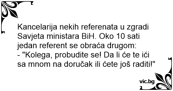 Kancelarija nekih referenata u zgradi Savjeta ministara BiH. Oko 10 sati jedan referent se obraća drugom: