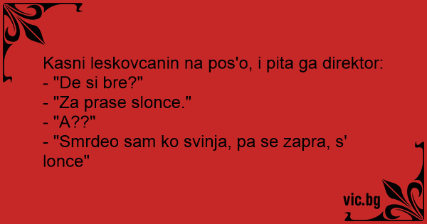 Kasni leskovcanin na pos'o, i pita ga direktor: