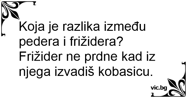 Koja je razlika između pedera i frižidera? Frižider ne prdne kad iz njega izvadiš kobasicu.