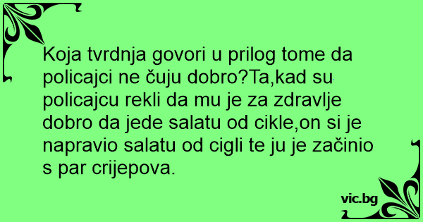 Koja tvrdnja govori u prilog tome da policajci ne čuju dobro?Ta,kad su policajcu rekli da mu je za zdravlje dobro da jede salatu od cikle,on si je napravio salatu od cigli te ju je začinio s par crijepova.