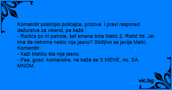- Radiće po tri patrole, šef smene biće Matić 2. Ristić itd. Jel ima da nekome nešto nije jasno? Stidljivo se javlja Matić.