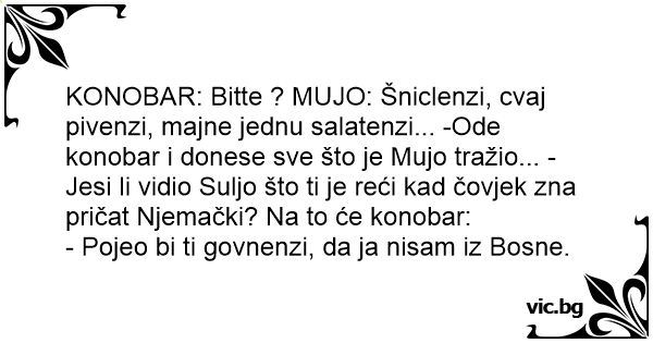 KONOBAR: Bitte ? MUJO: Šniclenzi, cvaj pivenzi, majne jednu salatenzi... -Ode konobar i donese sve što je Mujo tražio... - Jesi li vidio Suljo što ti je reći kad čovjek zna pričat Njemački? Na to će konobar: