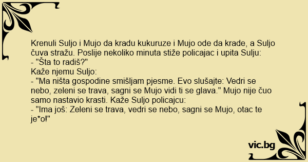 Krenuli Suljo i Mujo da kradu kukuruze i Mujo ode da krade, a Suljo čuva stražu. Poslije nekoliko minuta stiže policajac i upita Sulju: