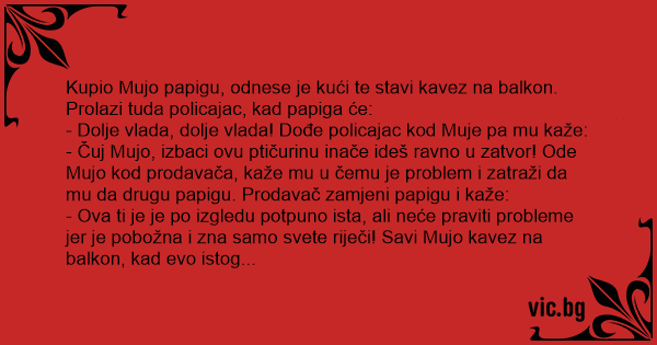 - Čuj Mujo, izbaci ovu ptičurinu inače ideš ravno u zatvor! Ode Mujo kod prodavača, kaže mu u čemu je problem i zatraži da mu da drugu papigu. Prodavač zamjeni papigu i kaže: