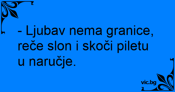 - Ljubav nema granice, reče slon i skoči piletu u naručje.