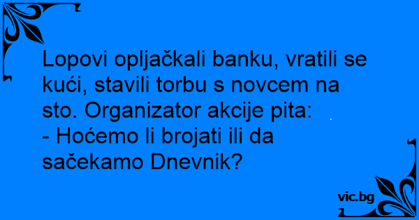 Lopovi opljačkali banku, vratili se kući, stavili torbu s novcem na sto. Organizator akcije pita: