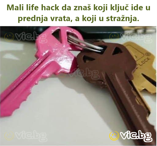 Само един малък лайфхак, за да знаеш кой ключ е за входната врата и кой е за задната. Само еден мал хак за да знаеш кој клуч е за предната врата и кој е за задната. Just a little life hack to know which key goes in the front door and which goes in the back door Un pequeño truco para saber qué llave es la de la puerta principal y cuál es la de atrás. Небольшой лайфхак, чтобы знать, какой ключ от входной двери, а какой — от задней. Ein kleiner Lifehack, damit du weißt, welcher Schlüssel zur Haustür gehört und welcher zur Hintertür. Une petite astuce pour savoir quelle clé va à la porte d’entrée et laquelle à la porte de derrière. Ένα μικρό life hack για να ξέρεις ποιο κλειδί είναι για την μπροστινή πόρτα και ποιο για την πίσω. Un piccolo trucchetto per sapere quale chiave va nella porta d’ingresso e quale in quella sul retro. Hangi anahtarın ön kapıya, hangisinin arka kapıya ait olduğunu anlamak için küçük bir hayat hilesi. Невеликий лайфхак, щоб знати, який ключ від вхідних дверей, а який — від задніх. Um pequeno truque para saber qual chave é da porta da frente e qual é da porta dos fundos. Mały life hack, żeby wiedzieć, który klucz jest do drzwi frontowych, a który do tylnych. Ett litet life hack för att veta vilken nyckel som går till ytterdörren och vilken som går till bakdörren. Een kleine lifehack om te weten welke sleutel op de voordeur past en welke op de achterdeur. Et lille life hack til at vide, hvilken nøgle der passer til hoveddøren, og hvilken der passer til bagdøren. Et lite life hack for å vite hvilken nøkkel som er til ytterdøra og hvilken som er til bakdøra. Pieni life hack, jotta tiedät, mikä avain on etuoveen ja mikä takaoveen. Egy kis life hack, hogy tudd, melyik kulcs való a bejárati ajtóhoz, és melyik a hátsó ajtóhoz. Un mic life hack ca să știi care cheie e pentru ușa din față și care e pentru ușa din spate. Malý life hack, abys věděl, který klíč je od předních dveří a který od zadních. Mažas „life hack“, kad žinotum, kuris raktas tinka priekinėms durims, o kuris – galinėms. Mazs life hack, lai zinātu, kura atslēga ir priekšējām durvīm un kura – aizmugurējām.