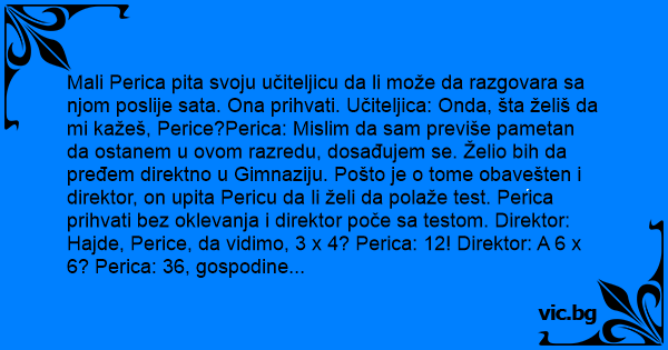 Mali Perica pita svoju učiteljicu da li može da razgovara sa njom poslije sata. Ona prihvati. Učiteljica: Onda, šta želiš da mi kažeš, Perice?Perica: Mislim da sam previše pametan da ostanem u ovom razredu, dosađujem se. Želio bih da pređem direktno u Gimnaziju. Pošto je o tome obavešten i direktor, on upita Pericu da li želi da polaže test. Perica prihvati bez oklevanja i direktor poče sa testom. Direktor: Hajde, Perice, da vidimo, 3 x 4? Perica: 12! Direktor: A 6 x 6? Perica: 36, gospodine direktore. Direktor: Glavni grad Japana? Perica: Tokio. Test se nastavlja narednih pola sata, Perica ne pravi nijednu grešku!Na kraju testa, direktor je zadovoljan, ali učiteljica pita da li ona sada može da postavi nekoliko pitanja. Obojica pristaju i ona počinje. Učiteljica: Dobro, Perice. Krava ih ima 4, a ja ih imam 2, šta je to? Perica: Noge, gospođo. Učiteljica: Točno. Šta može da se nadje u tvojim hlačama, a u mojim ih nema? Direktora iznenadi pitanje... Perica: Džepovi, gospođo. Učiteljica: Dobro, Perice. Gde žene imaju najkovrdžavije dlake? Direktor se sprema da interveniše kada Perica odgovori. Perica: U Africi, gospodjo. Učiteljica: Šta je meko, ali, na rukama žene, postane tvrdo?Direktor razrogači oči, ali Perica odgovora. Perica: Lak za nokte, gospodjo. Uciteljica: Šta muškarci i mi žene imamo na sred nogu? Perica: Kolena! Uciteljica: Dobro. A šta udata žena ima šire od neudate? Direktor ne može da veruje svojim ušima! Perica: Krevet, gospođo. Učiteljica: Koji deo mog tela je često najvlažniji? Perica: Vaš jezik, gospodjo. Učiteljica: Koja reč počinje slovom "p" a označava nešto što može da bude vlažno ili suho i što muškarci vole da gledaju? Perica: Put!Direktor, bez daha, sav mokar od znoja, odluči da prekine test i uzviknu: Neću te poslati u gimnaziju, već direktno na fakultet! Čak bih i ja odgovorio pogrešno na sva pitanja iz testa... Naravoučenije: Čovek sa godinama postaje perverzan!