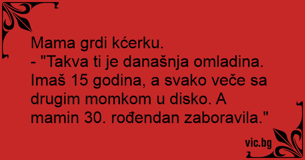- "Takva ti je današnja omladina. Imaš 15 godina, a svako veče sa drugim momkom u disko. A mamin 30. rođendan zaboravila."