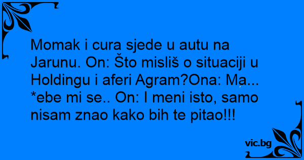Momak i cura sjede u autu na Jarunu. On: Što misliš o situaciji u Holdingu i aferi Agram?Ona: Ma... *ebe mi se.. On: I meni isto, samo nisam znao kako bih te pitao!!!