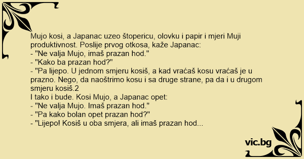 Mujo kosi, a Japanac uzeo štopericu, olovku i papir i mjeri Muji produktivnost. Poslije prvog otkosa, kaže Japanac: