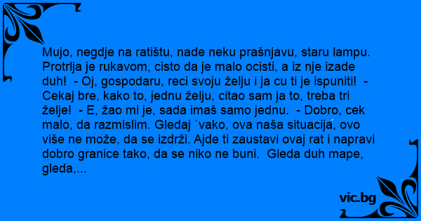 Mujo, negdje na ratištu, nade neku prašnjavu, staru lampu. Protrlja je rukavom, cisto da je malo ocisti, a iz nje izade duh! - Oj, gospodaru, reci svoju želju i ja cu ti je ispuniti! - Cekaj bre, kako to, jednu želju, citao sam ja to, treba tri želje! - E, žao mi je, sada imaš samo jednu. - Dobro, cek malo, da razmislim. Gledaj `vako, ova naša situacija, ovo više ne može, da se izdrži. Ajde ti zaustavi ovaj rat i napravi dobro granice tako, da se niko ne buni. Gleda duh mape, gleda, gleda... - Znaš šta, ovo je bre mnogo komplikovano. Imaš li ti neku rezervnu želju, ovo je ipak za politicare. - Hmmmm... Znaš šta, moja je Fata mnogo ružna žena, ajde napravi je najljepšom ženom na svijetu. - Gdje ti je ta tvoja Fata, da je vidim. - Eno je tamo. Gleda duh Fatu, gleda, gleda... pa rece: