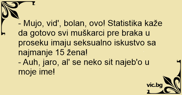 - Mujo, vid', bolan, ovo! Statistika kaže da gotovo svi muškarci pre braka u proseku imaju seksualno iskustvo sa najmanje 15 žena!