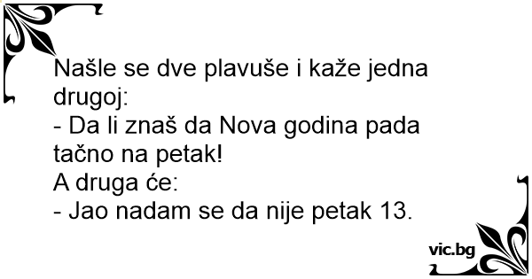 Дві білявки: — А ти знаєш, що цього року Новий рік припадає на п’ятницю?! — Ой. Лише б не п’ятниця 13-те…