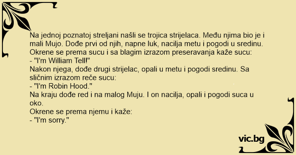 Na jednoj poznatoj streljani našli se trojica strijelaca. Među njima bio je i mali Mujo. Dođe prvi od njih, napne luk, nacilja metu i pogodi u sredinu. Okrene se prema sucu i sa blagim izrazom preseravanja kaže sucu: