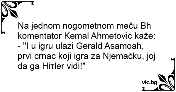 Български English Deutsch Español Русский Français Italiano Ελληνικά Македонски Türkçe Українська Português Polski Svenska Nederlands Dansk Norsk Suomi Magyar Româna Čeština Lietuvių Latviešu Na jednom nogometnom meču Bh komentator Kemal Ahmetović kaže: - "I u igru ulazi Gerald Asamoah, prvi crnac koji igra za Njemačku, joj da ga Нiтlеr vidi!"
