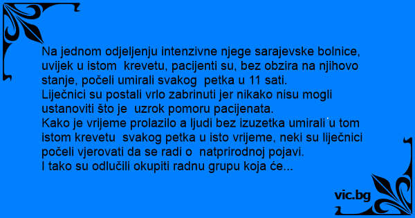 Na jednom odjeljenju intenzivne njege sarajevske bolnice, uvijek u istom krevetu, pacijenti su, bez obzira na njihovo stanje, počeli umirali svakog petka u 11 sati.
