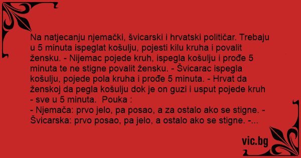 Na natjecanju njemački, švicarski i hrvatski političar. Trebaju u 5 minuta ispeglat košulju, pojesti kilu kruha i povalit žensku. - Nijemac pojede kruh, ispegla košulju i prođe 5 minuta te ne stigne povalit žensku. - Švicarac ispegla košulju, pojede pola kruha i prođe 5 minuta. - Hrvat da ženskoj da pegla košulju dok je on guzi i usput pojede kruh - sve u 5 minuta. Pouka :