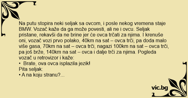Na putu stopira neki seljak sa ovcom, i posle nekog vremena staje BMW. Vozač kaže da ga može povesti, ali ne i ovcu. Seljak pristane, rekavši da ne brine jer će ovca trčati za njima. I krenuše oni, vozač vozi prvo polako, 40km na sat – ovca trči, pa doda malo više gasa, 70km na sat – ovca trči, nagazi 100km na sat – ovca trči, pa još brže, 140km na sat – ovca i dalje trči za njima. Pogleda vozač u retrovizor i kaže: