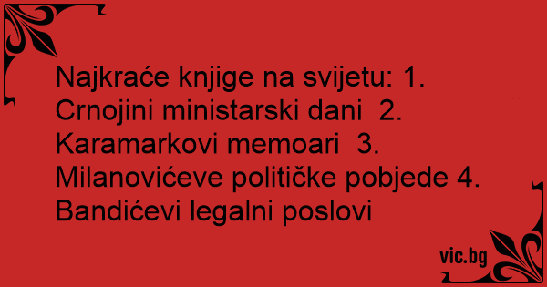 Najkraće knjige na svijetu: 1. Crnojini ministarski dani 2. Karamarkovi memoari 3. Milanovićeve političke pobjede 4. Bandićevi legalni poslovi