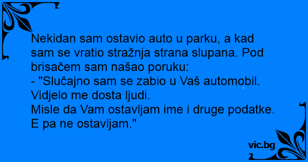 Nekidan sam ostavio auto u parku, a kad sam se vratio stražnja strana slupana. Pod brisačem sam našao poruku: