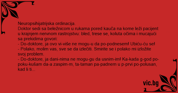 - Do-doktore, ja dani-nima ne mogu-gu da usnim-im! Ka-kada g-god po-poku-kušam da-a zaspim-m, ta-taman pa-padnem u p-prvi po-polusan, kad li ti se odn-odne-kuda iznenada-nada po-pojavi jato-to koko-košaka, jedno