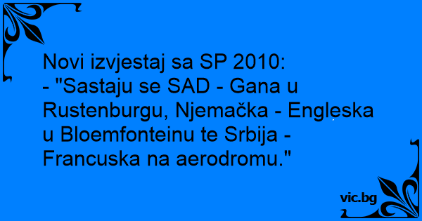 - "Sastaju se SAD - Gana u Rustenburgu, Njemačka - Engleska u Bloemfonteinu te Srbija - Francuska na aerodromu."