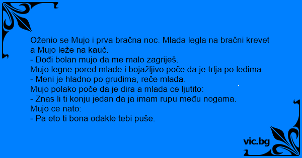 Oženio se Mujo i prva bračna noc. Mlada legla na bračni krevet a Mujo leže na kauč.