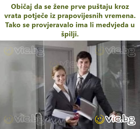 Обичајот жените да се пуштаат први низ вратата потекнува од праисториски времиња. Така се проверувало дали нема мечки во пештерата.