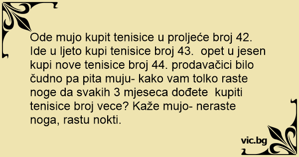 Ode mujo kupit tenisice u proljeće broj 42. Ide u ljeto kupi tenisice broj 43. opet u jesen kupi nove tenisice broj 44. prodavačici bilo čudno pa pita muju- kako vam tolko raste noge da svakih 3 mjeseca dođete kupiti tenisice broj vece? Kaže mujo- neraste noga, rastu nokti.