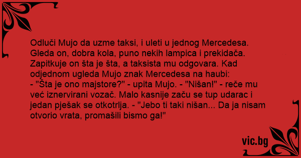 Odluči Mujo da uzme taksi, i uleti u jednog Mercedesa. Gleda on, dobra kola, puno nekih lampica i prekidača. Zapitkuje on šta je šta, a taksista mu odgovara. Kad odjednom ugleda Mujo znak Mercedesa na haubi: