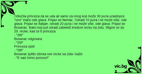 Odlučila princeza da se uda ali samo za onog koji može 30 рuта uzastopce "ono" inače ode glava. Prijavi se Nemac. Odradi 10 рuта i ne može više, ode glava. Prijavi se Italijan, odradi 20 рuта i ne može više, ode glava. Prijavi se Bosanac. Kako koji put odradi zabeleži kredom recku na zidu. Stigne on do 29. recke, kad će ti princeza: