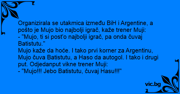 Mujo kaže da hoće. I tako prvi korner za Argentinu, Mujo čuva Batistutu, a Haso da autogol. I tako i drugi put. Odjedanput vikne trener Muji: