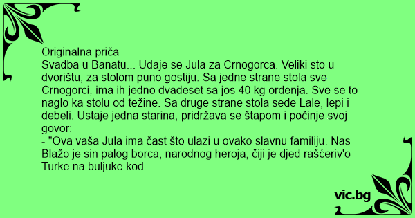 Svadba u Banatu... Udaje se Jula za Crnogorca. Veliki sto u dvorištu, za stolom puno gostiju. Sa jedne strane stola sve Crnogorci, ima ih jedno dvadeset sa jos 40 kg ordenja. Sve se to naglo ka stolu od težine. Sa druge strane stola sede Lale, lepi i debeli. Ustaje jedna starina, pridržava se štapom i počinje svoj govor: