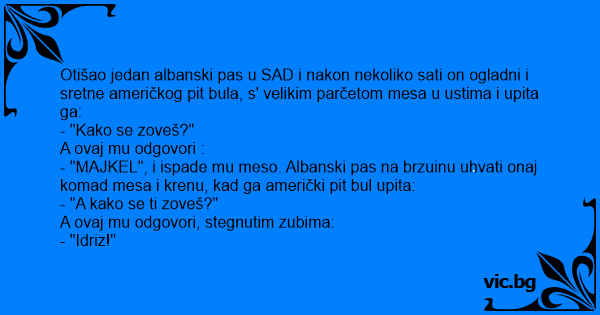 Otišao jedan albanski pas u SAD i nakon nekoliko sati on ogladni i sretne američkog pit bula, s' velikim parčetom mesa u ustima i upita ga: