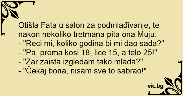 Otišla Fata u salon za podmlađivanje, te nakon nekoliko tretmana pita ona Muju: