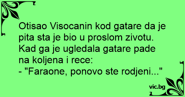 Otisao Visocanin kod gatare da je pita sta je bio u proslom zivotu. Kad ga je ugledala gatare pade na koljena i rece: