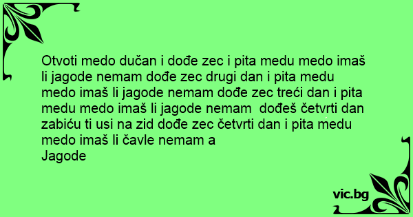 Otvoti medo dučan i dođe zec i pita medu medo imaš li jagode nemam dođe zec drugi dan i pita medu medo imaš li jagode nemam dođe zec treći dan i pita medu medo imaš li jagode nemam dođeš četvrti dan zabiću ti usi na zid dođe zec četvrti dan i pita medu medo imaš li čavle nemam a
