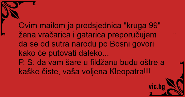 Ovim mailom ja predsjednica "kruga 99" žena vračarica i gatarica preporučujem da se od sutra narodu po Bosni govori kako će putovati daleko...