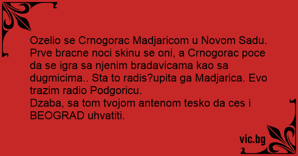 Ozelio se Crnogorac Madjaricom u Novom Sadu. Prve bracne noci skinu se oni, a Crnogorac poce da se igra sa njenim bradavicama kao sa dugmicima.. Sta to radis?upita ga Madjarica. Evo trazim radio Podgoricu.