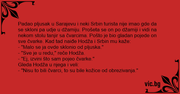 Padao pljusak u Sarajevu i neki Srbin turista nije imao gde da se skloni pa udje u džamiju. Prošeta se on po džamiji i vidi na nekom stolu tanjir sa čvarcima. Pošto je bio gladan pojede on sve čvarke. Kad tad naiđe Hodža i Srbin mu kaže: