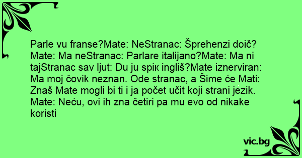 Parle vu franse?Mate: NeStranac: Šprehenzi doič?Mate: Ma neStranac: Parlare italijano?Mate: Ma ni tajStranac sav ljut: Du ju sрiк ingliš?Mate iznerviran: Ma moj čovik neznan. Ode stranac, a Šime će Mati: Znaš Mate mogli bi ti i ja počet učit koji strani jezik. Mate: Neću, ovi ih zna četiri pa mu evo od nikake koristi