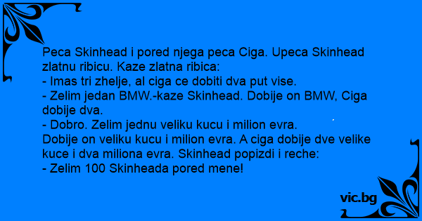 Dobije on veliku kucu i milion evra. A ciga dobije dve velike kuce i dva miliona evra. Skinhead popizdi i reche: